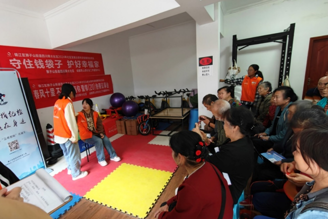 随后,四位普法宣讲人分别从保健品诈骗、缴纳养老金诈骗、冒充公检法诈骗、低价旅游诈骗四种方式,向老年居民介绍常见行骗手段,如何分辨、抵制诈骗行为以及有效维护权利的途径。并通过有奖问答来检验和巩固学习成果,在场老年居民踊跃参与问答并得到相应的礼物。